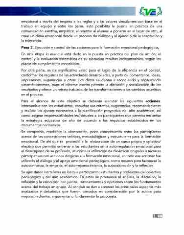emocional a través del respeto a las reglas y a los valores vinculantes con base en el trabajo en equipo y entre los pares, esto posibilita la puesta en práctica de una comunicación asertiva, empática, al orientar al alumno a ponerse en el lugar de otro, al crear un clima emocional desde un proceso de diálogo y el ejercicio de la aceptación y la tolerancia.